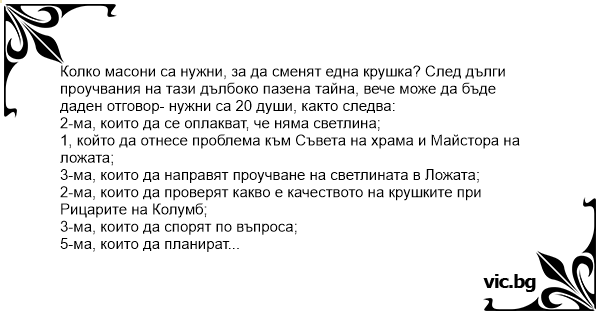 Колко масони са нужни, за да сменят една крушка? След дълги проучвания на тази дълбоко пазена тайна, вече може да бъде даден отговор- нужни са 20 души, както следва: