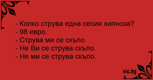 - Колко струва една сесия хипноза?<br />- 98 евро.<br />- Струва ми се скъпо.<br />- Не Ви се струва скъпо.<br />- Не ми се струва скъпо.