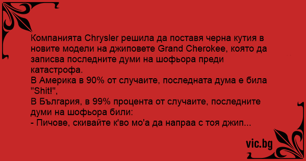 Компанията Chrysler решила да поставя черна кутия в новите модели на джиповете Grand Cherokee, която да записва последните думи на шофьора преди катастрофа.