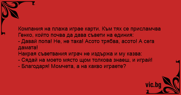 Компания на плажа играе карти. Към тях се присламчва Генко, който почва да дава съвети на единия: