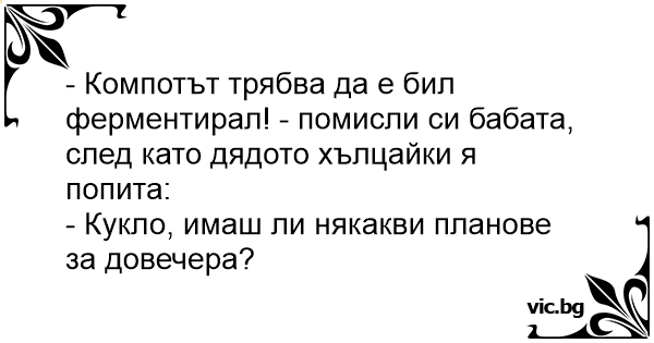 - Компотът трябва да е бил ферментирал! - помисли си бабата, след като дядото хълцайки я попита: