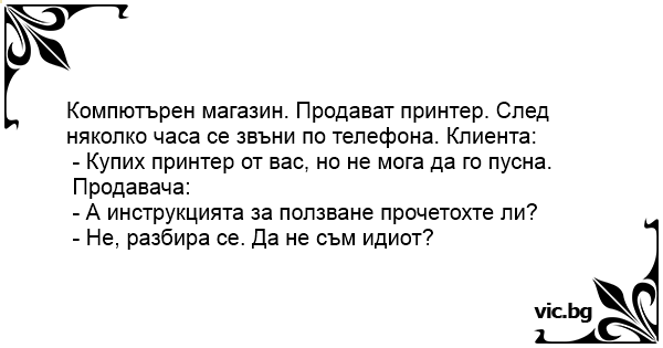 Компютърен магазин. Продават принтер. След няколко часа се звъни по телефона. Клиента:
