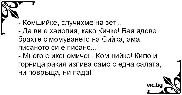 - Да ви е хаирлия, како Кичке! Бая ядове брахте с момуването на Сийка, ама писаното си е писано...