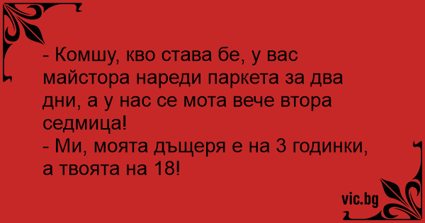 - Комшу, кво става бе, у вас майстора нареди паркета за два дни, а у нас се мота вече втора седмица!