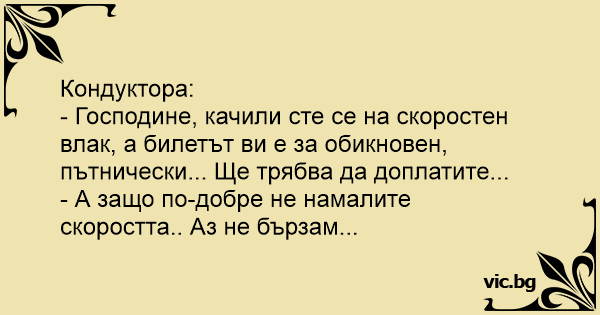- Господине, качили сте се на скоростен влак, а билетът ви е за обикновен, пътнически... Ще трябва да доплатите...