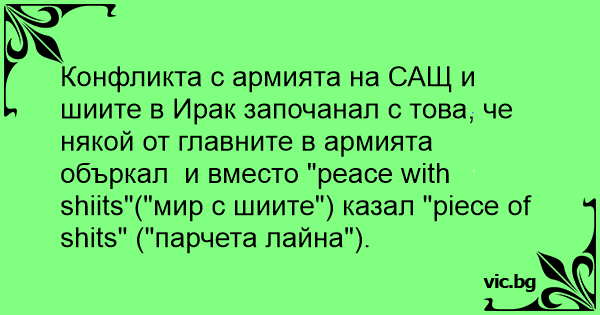 Конфликта с армията на САЩ и шиите в Ирак започанал с това, че някой от главните в армията объркал и вместо "peace with shiits"("мир с шиите") казал "piece of shiтs" ("парчета лaйнa").