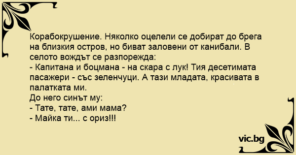 - Капитана и боцмана - на скара с лук! Тия десетимата пасажери - със зеленчуци. А тази младата, красивата в палатката ми.