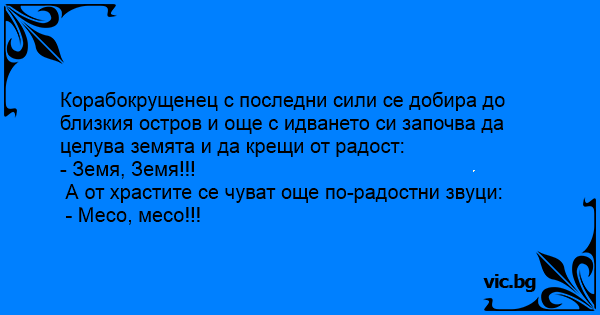 Корабокрущенец с последни сили се добира до близкия остров и още с идването си започва да целува земята и да крещи от радост: