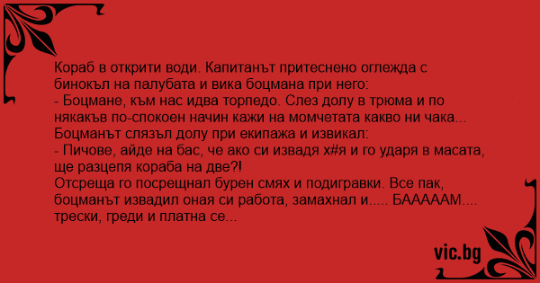 - Боцмане, към нас идва торпедо. Слез долу в трюма и по някакъв по-спокоен начин кажи на момчетата какво ни чака...