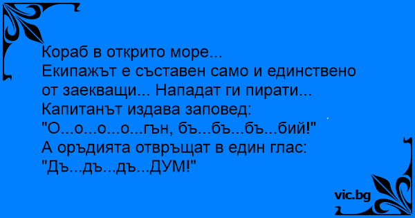 Екипажът е съставен само и единствено от заекващи... Нападат ги пирати... Капитанът издава заповед: "О...о...о...о...гън, бъ...бъ...бъ...бий!"