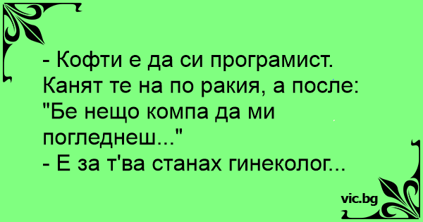 - Кофти е да си програмист. Канят те на по ракия, а после: "Бе нещо компа да ми погледнеш..."
