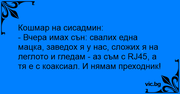 - Вчера имах сън: свалих една мацка, заведох я у нас, сложих я на леглото и гледам - аз съм с RJ45, а тя е с коаксиал. И нямам преходник!