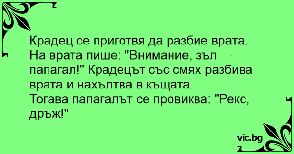 На врата пише: "Внимание, зъл папагал!" Крадецът със смях разбива врата и нахълтва в къщата.