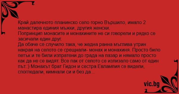 Да обаче се случило така, че жедна ранна мъглива утрин накрая на селото се срещнали- монах и монахиня. Просто било петък и те били изпратени до града на пазар и нямало просто как да не се видят. Все пак от селото се излизало само от един път.:) Монахът брат Гидон и сестра Евлампия се видели, спогледали, кимнали си и без да промълвят дума поели към града.