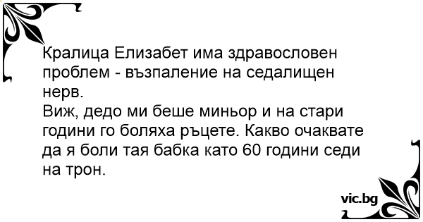 Виж, дедо ми беше миньор и на стари години го боляха ръцете. Какво очаквате да я боли тая бабка като 60 години седи на трон.