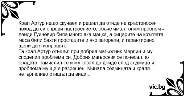 Та крал Артур отишъл при добрия магьосник Мерлин и му споделил проблема си. Добрия магьосник се почесал по брадата, замислил се и му казал да дойде след седмица и проблема му ще е разрешен. Минала седмицата и краля нетърпеливо отишъл да види какво става, че много му се ходело на кръстоносен поход, а в Лидл били пуснали палатки на промоция и така щял да спести от командировъчни. Мерлин бръкнал в един шкаф и извадил едни железни гащи, но крал Артур моментално забелязал потенциален фал в дизайна - отдолу на гащите имало една голяма дупка, и нервно попитал: