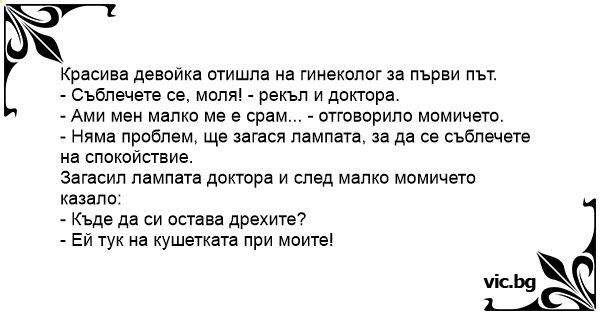 Στον Παθολόγο Νο 2 Сексапилна мадама отива на преглед при лекаря. В кабинете проктолога: Une patiente se rend chez le gynécologue. Ce dernier lui dit : Un médico le dice a su paciente: - Por favor señorita, desnúdese. - Pero doctor...me da mucha vergüenza. - Tranquila, voy a apagar la luz. - Bueno está bien... ¿Dónde puedo poner mi ropa? -Aquí en el sofá, junto a la mía. Przychodzi blondynka do lekarza. - Proszę się rozebrać - mówi lekarz. - Gdzie położyć rzeczy? - Obok moich. C'est une fille qui doit aller chez le gynéco pour la première fois de sa vie. Elle est assez impressionnée, et encore plus par le fait que le gynécologue est un homme... Le docteur lui dit de se... Nuori nainen oli menossa gynekologille ensimmäistä kertaa. Oman nimen kuultuaan, hän tepasteli sisään huoneeseen hieman jännittyneenä. Nainen alkoi riisumaan vaatteitaan ja samalla nopeasti koko... Una bella ragazza si presenta dal medico: “Dottore, la prego, non mi guardi cosi’. Sono molto timida”. “Su, signorina, si spogli tranquillamente. Mi girero’ dall’altra parte. E poi sono un medico,... O tinara fermecatoare de duce la doctor pentru un Consult periodic. Doctorul ii cere sa se dezbrace si Sa-si puna hainele in cuierul alaturat. - Chilotii unde sa mi-i pun, domnule doctor? - Pe... Eine schüchterne junge Frau kommt zu Frauenarzt. "Ziehen Sie sich schon mal aus", sagt der. Aber sie ziert sich. Meint der Arzt: "Ich dunkle den Raum etwas ab, dann fällt es Ihnen leichter!" Sie...