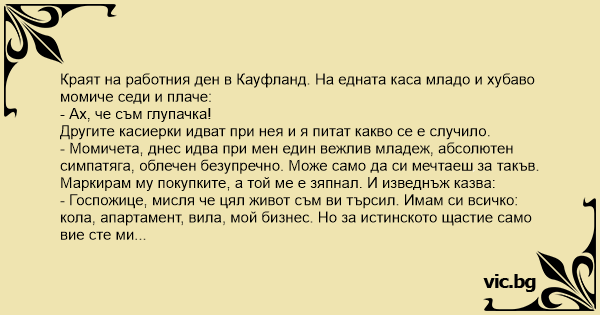 Краят на работния ден в Кауфланд. На едната каса младо и хубаво момиче седи и плаче: