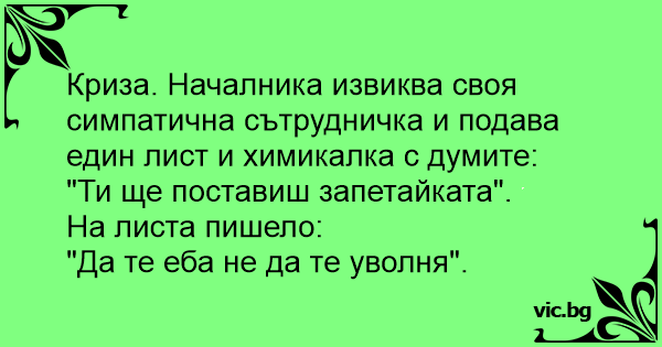 Криза. Началника извиква своя симпатична сътрудничка и подава един лист и химикалка с думите: