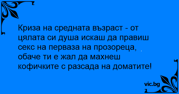 Криза на средната възраст - от цялата си душа искаш да правиш cekc на перваза на прозореца, обаче ти е жал да махнеш кофичките с разсада на доматите!