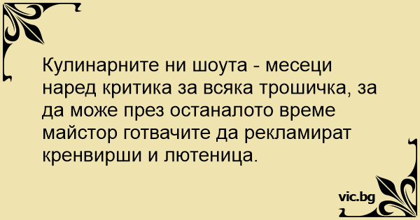 Кулинарните ни шоута - месеци наред критика за всяка трошичка, за да може през останалото време майстор готвачите да рекламират кренвирши и лютеница.