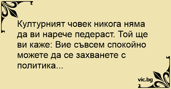 Културният човек никога няма да ви нарече пeдepact. Той ще ви каже: Вие съвсем спокойно можете да се захванете с политика...
