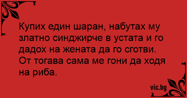 Купих един шаран, набутах му златно синджирче в устата и го дадох на жената да го сготви. От тогава сама ме гони да ходя на риба.