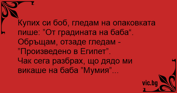 Купих си боб, гледам на опаковката пише: ”От градината на баба“. Обръщам, отзаде гледам - ”Произведено в Египет”.