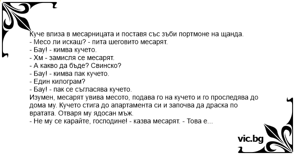 - Не му се карайте, господине! - казва месарят. - Това е най-интелигентното куче, което някога съм виждал!
