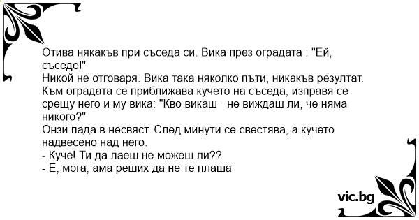 Отива някакъв при съседа си. Вика през оградата : "Ей, съседе!"