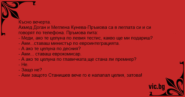 Ахмед Доган и Меглена Кунева-Пръмова са в леглата си и си говорят по телефона. Пръмова пита: