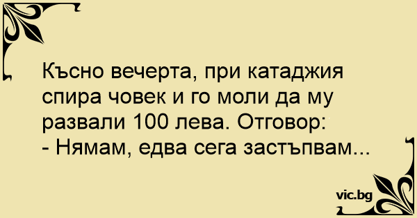 Късно вечерта, при катаджия спира човек и го моли да му развали 100 лева. Отговор: