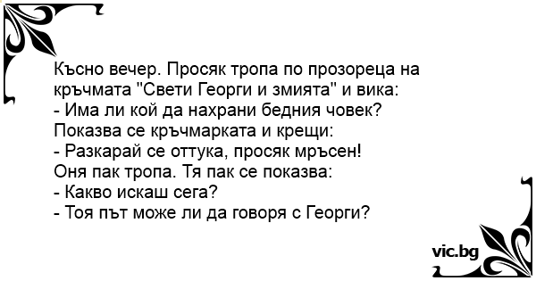 Късно вечер. Просяк тропа по прозореца на кръчмата "Свети Георги и змията" и вика: