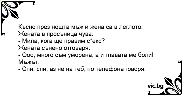 Мажот и жената во кревет. - Мажот: Дали си расположена за секс? - Жената (поспано): - Не можам, уморна сум, а и главата ме боли. Мажот: Не бе, спиј си ти, зборувам на телефон...