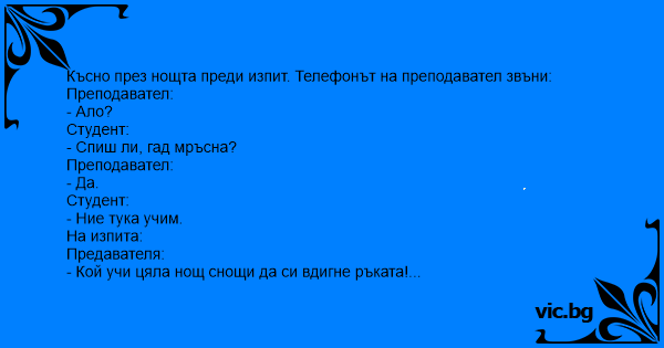 Късно през нощта преди изпит. Телефонът на преподавател звъни: Преподавател: