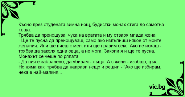 - Ще те пусна да пренощуваш, само ако изпълниш някое от моите желания. Или ще пиеш с мен, или ще правим cekc. Ако не искаш - трябва да заколя една овца, а не мога. Заколи я и ще те пусна.