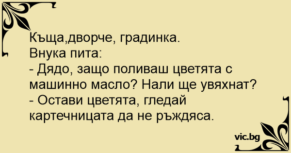 - Дядо, защо поливаш цветята с машинно масло? Нали ще увяхнат?