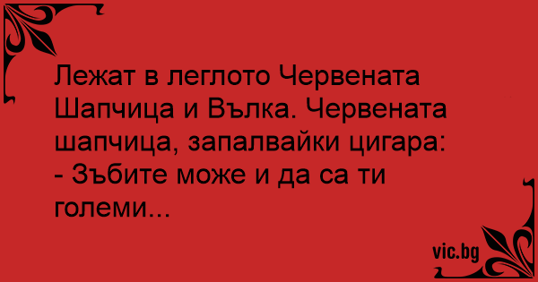 Лежат в леглото Червената Шапчица и Вълка. Червената шапчица, запалвайки цигара: