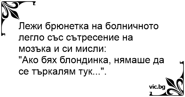 Лежи брюнетка на болничното легло със сътресение на мозъка и си мисли: