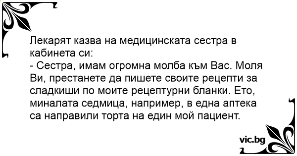 - Сестра, имам огромна молба към Вас. Моля Ви, престанете да пишете своите рецепти за сладкиши по моите рецептурни бланки. Ето, миналата седмица, например, в една аптека са направили торта на един мой пациент.