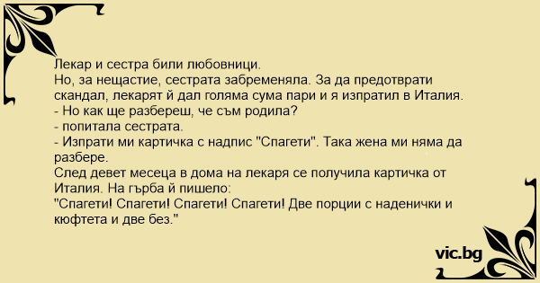 Un homme met accidentellement sa maîtresse enceinte. Pour ne pas que sa femme soit au courant, il propose à la future maman: - Tu vas aller en Italie pendant 9 mois. Et lorsque le bébé viendra au... Un médecin a une aventure extra-conjugale avec son infirmière. Elle lui annonce un matin qu’elle est enceinte. Comme le médecin ne veut pas que son épouse ait le moindre doute, il remet à... Egy doktornak viszonya van az ápolónőjével, aki teherbe esik tőle. Mivel nem akarja, hogy a felesége is tudomást szerezzen a gyerekről, kitömi egy kis pénzzel az ápolónőt és megkéri, hogy menjen el... Un abogado mantiene un romance con su secretaria. Al poco tiempo ésta queda embarazada y el abogado, que no quiere que su esposa se entere, le da a una buena suma de dinero y le pide que vaya a... Un barbat, satul de greutatile din Romania, pleaca in Italia la munca, asa cum se intampla din ce in ce mai des in ultima vreme. Acolo se incurca cu o italianca si o lasa insarcinata. Pentru ca... Op een dag, ongeveer negen maanden later, trof de man zijn vrouw in een verwarde toestand aan. "Schat," zei ze, "je hebt een heel vreemd kaartje ontvangen." "Oh, geef het maar aan mij wellicht snap... A wealthy man was having an affair with an Italian woman for a few years. One night, during one of their rendezvous, she confided in him that she was pregnant. Not wanting to ruin his reputation or... O sujeito engravidou a secretária e para esconder o caso, deu-lhe uma boa soma em dinheiro e mandou-a para Itália, onde ela poderia ter o bebê tranquilamente e ninguém ficaria sabendo de nada.... Een dokter heeft een slippertje met zijn verpleegster. Op een goede (of slechte) ochtend meldt zij hem dat ze zwanger is. Aangezien de dokter niet wil dat zijn vrouw maar de minste onraad ruikt,... O homem estava tendo um caso com a secretária. Após um tempo, ela lhe disse que estava grávida. Não querendo que sua mulher soubesse, deu dinheiro à secretária, mandou que ela fosse para a Itália e... Un avvocato ha una relazione clandestina con la sua segretaria. Quando la donna rimane incinta, per non essere scoperto dalla moglie, le suggerisce di farsi un lungo viaggio, da lui spesato. La donna allora chiede: "E come faccio a dirti quando è nato il bambino?" "Mandami una cartolina con... A doctor was having an affair with his nurse. Shortly afterward, she told him she was pregnant. Not wanting his wife to know, he gave the nurse a sum of money and asked her to go to Italy and have the baby there. The doctor Шпагети En betydelsefull man i Sveriges riksdag hade under många år en kärleksaffär med en italiensk kvinna. Under en av deras hemliga möten avslöjade hon att hon blivit gravid. För att inte förstöra sitt...