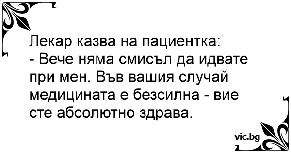 - Вече няма смисъл да идвате при мен. Във вашия случай медицината е безсилна - вие сте абсолютно здрава.