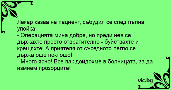- Операцията мина добре, но преди нея се държахте просто отвратително - буйствахте и крещяхте! А приятеля от съседното легло се държа още по-лошо!