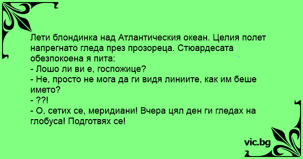 Лети блондинка над Атлантическия океан. Целия полет напрегнато гледа през прозореца. Стюардесата обезпокоена я пита:
