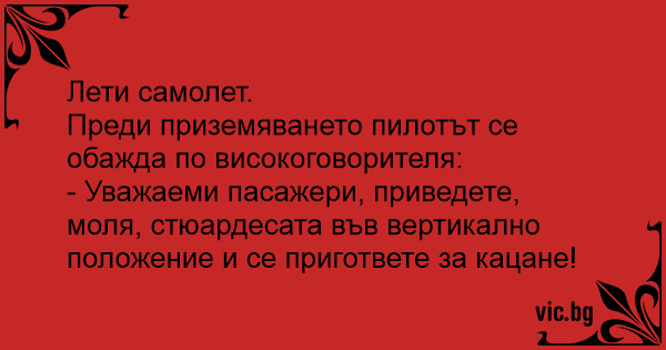 - Уважаеми пасажери, приведете, моля, стюардесата във вертикално положение и се пригответе за кацане!