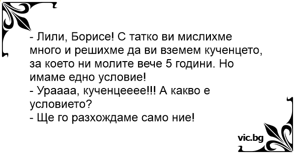 - Лили, Борисе! С татко ви мислихме много и решихме да ви вземем кученцето, за което ни молите вече 5 години. Но имаме едно условие!