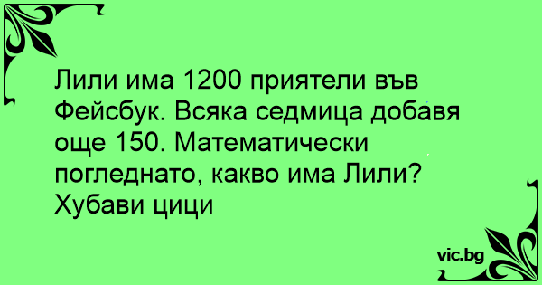 Лили има 1200 приятели във Фейсбук. Всяка седмица добавя още 150. Математически погледнато, какво има Лили?