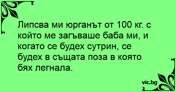 Липсва ми юрганът от 100 кг. с който ме загъваше баба ми, и когато се будех сутрин, се будех в същата поза в която бях легнала.