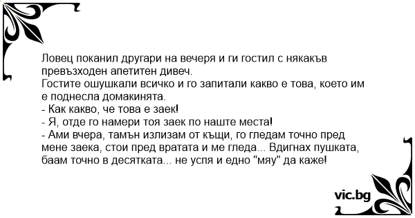 - Ами вчера, тамън излизам от къщи, го гледам точно пред мене заека, стои пред вратата и ме гледа... Вдигнах пушката, баам точно в десятката... не успя и едно "мяу" да каже!