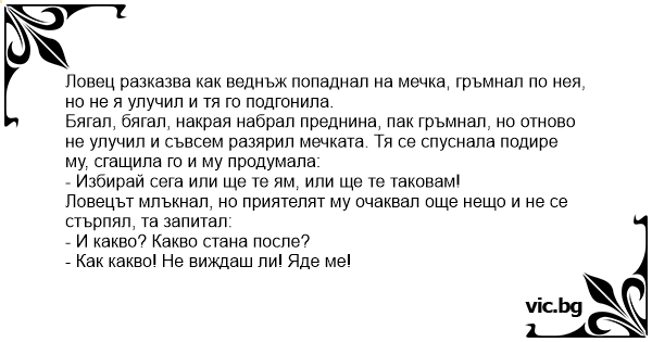 Ловец разказва как веднъж попаднал на мечка, гръмнал по нея, но не я улучил и тя го подгонила.